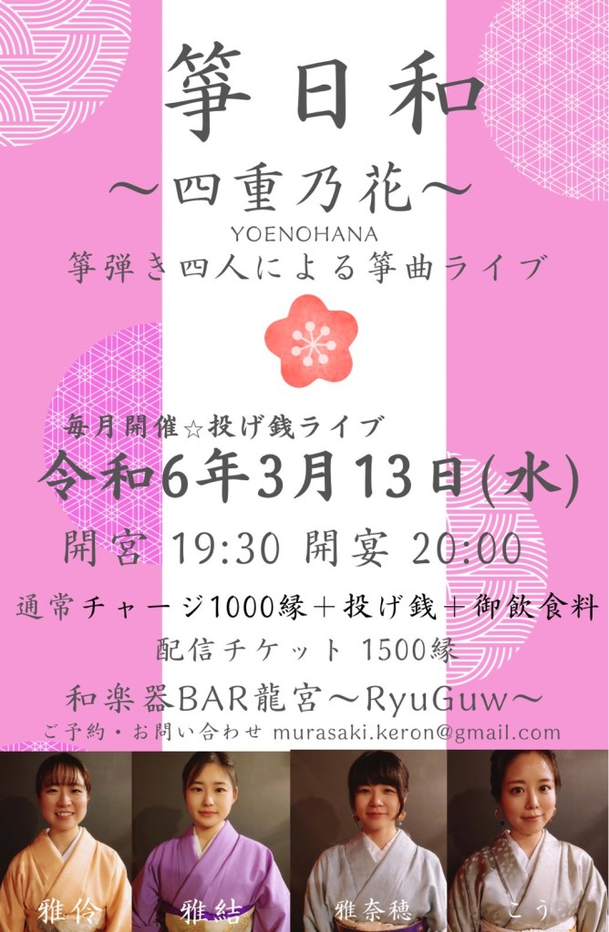 箏弾き4人によるグループ「四重乃花〜yoenohana〜」のライブも今月で第5回目となりました。お名前を見れば一目瞭然ですが、私以外は正派所属の若手メンバーです。THE名取✨と言った感じで大変羨ましい限りですがこればかりは仕方ないですね(o^^o)四重乃花では毎回、箏用の譜面で書かれた初級〜中級くらいの難易度の楽曲を選んで演奏しております。今のところカバー曲や五線譜の曲は敢えて外し、古曲・正派・宮城・現代曲をお届けしております。四重乃花の演奏を聞いて、この曲弾いてみたい!と言っていただけますように(o^^o)皆様のお越しをお待ちしております!今回は初の投げ銭ライブです♪